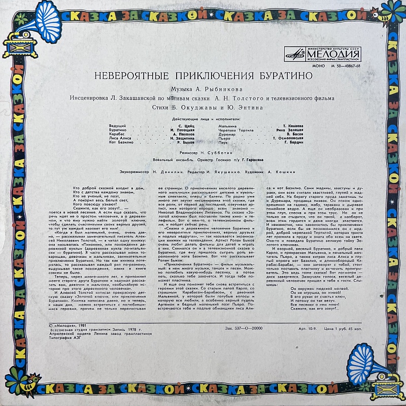 Товар Виниловая пластинка Исполнитель А. Толстой Наименование Невероятные Приключения Буратино Каталожный номер М 50 — 40867-68 Формат записи Альбом (LP) Количество пластинок 1 Размер пластинки 12" Цвет Black Страна USSR Год записи 1978 год Год издания 1981 год Тип издания Переиздание -