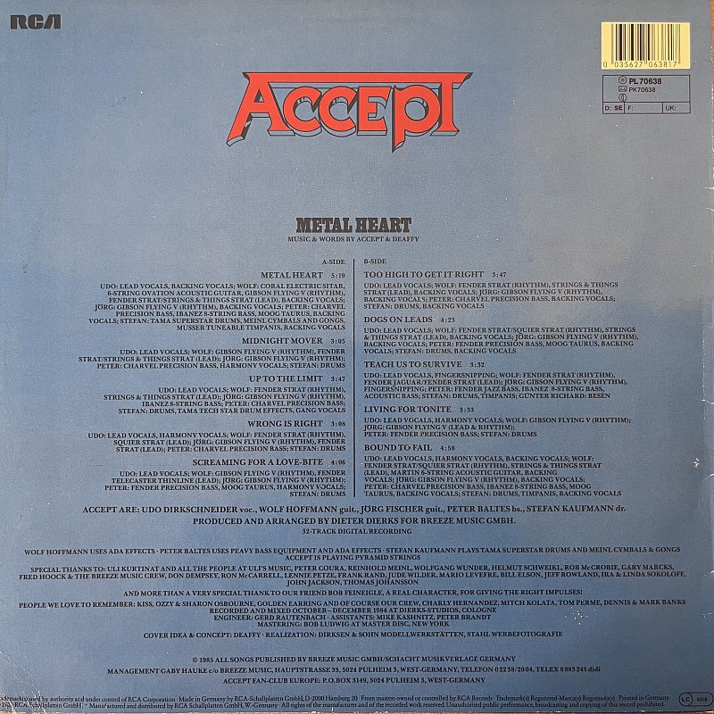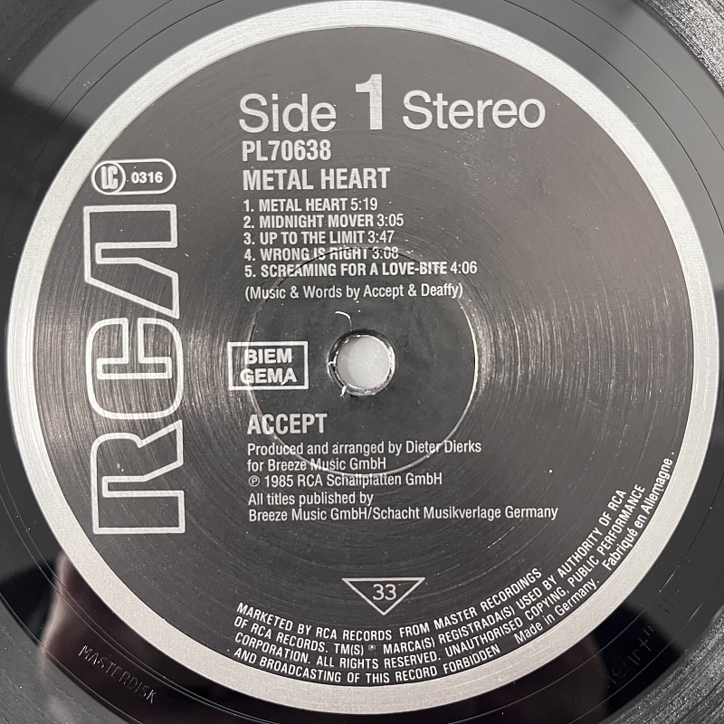 Товар Виниловая пластинка Исполнитель Accept Наименование Metal Heart Каталожный номер PL 70638 Формат записи Альбом (LP) Количество пластинок 1 Размер пластинки 12" Цвет Black Страна Германия Год записи 1985 год Год издания 1985 год Тип издания Оригинал -