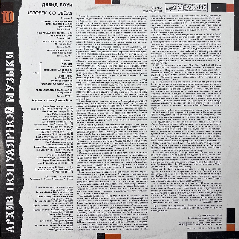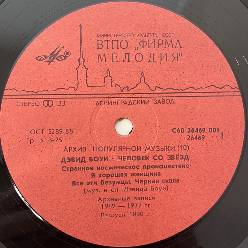 Товар Виниловая пластинка Исполнитель David Bowie Наименование Starman = Человек Со Звезд Каталожный номер C60 26469 001 Формат записи Сборник Количество пластинок 1 Размер пластинки 12" Цвет Black Страна USSR Год записи 1989 год Год издания 1990 год Тип издания Переиздание -