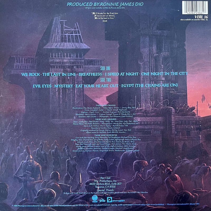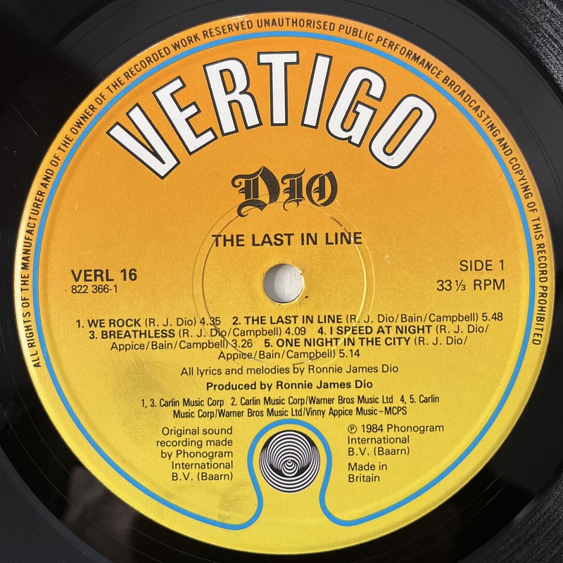 Товар Виниловая пластинка Баркод Исполнитель Dio Наименование The Last In Line Каталожный номер VERL 16 Формат записи Альбом (LP) Количество пластинок 1 Размер пластинки 12" Цвет Black Страна Великобритания Год записи 1984 год Год издания 1984 год Тип издания Оригинал -
